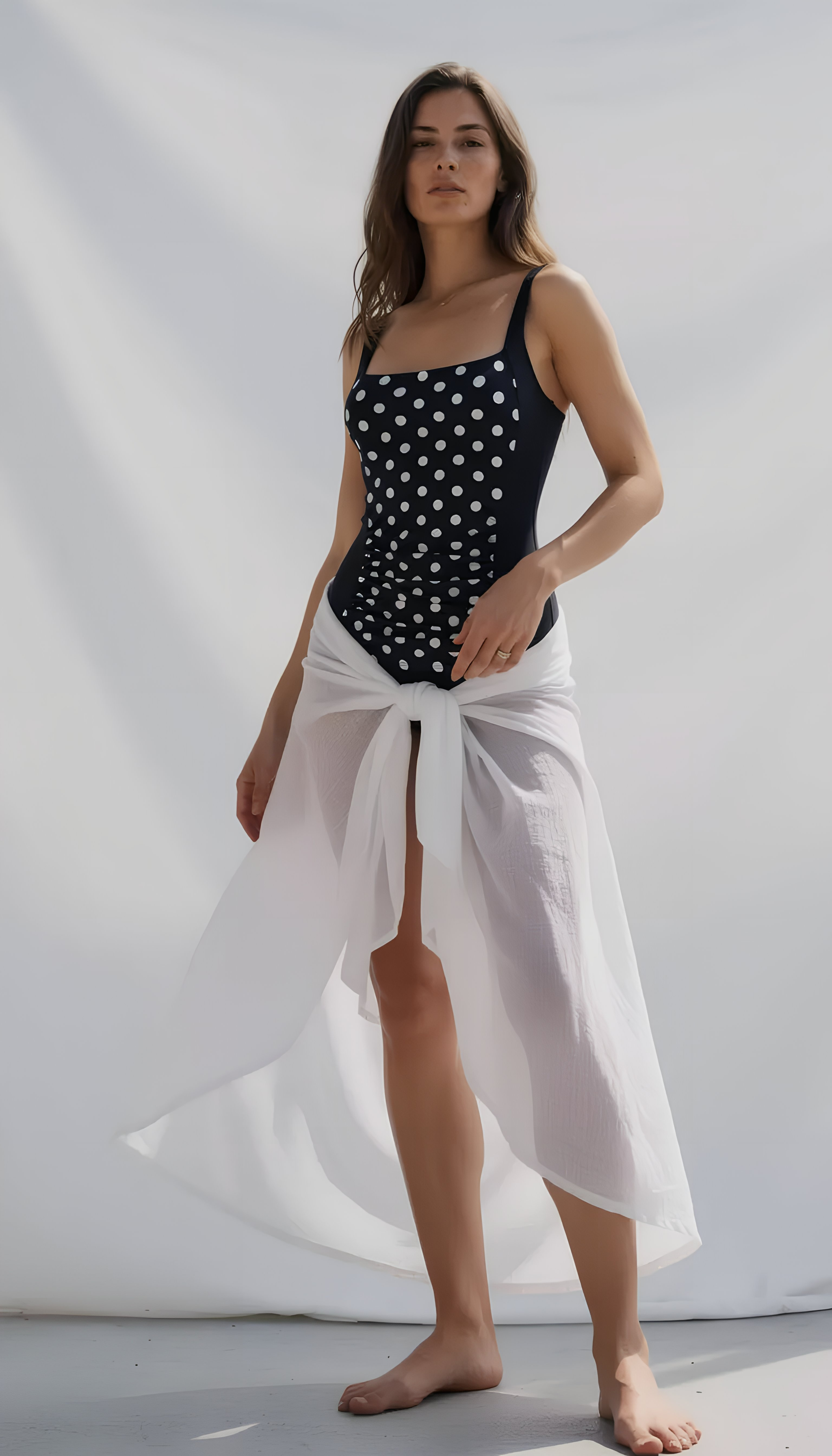 Ühevärvilise ja täpilise elegantse disainiga on see ujumistrikoo ideaalne kaaslane teie järgmisele rannakülastusele. Valmistatud kvaliteetsest polüestrist ja spandeksist, pakub see mugavust ja ideaalset sobivust .