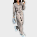 Avasta meie ideaalne komplekt, mis ühendab stiili ja praktilisuse ühes tükis. Sirge lõikega püksid ja suur nööbiga mantel loovad klassikalise välimuse, mis sobib igaks olukorraks — tööst väljasõiduni.